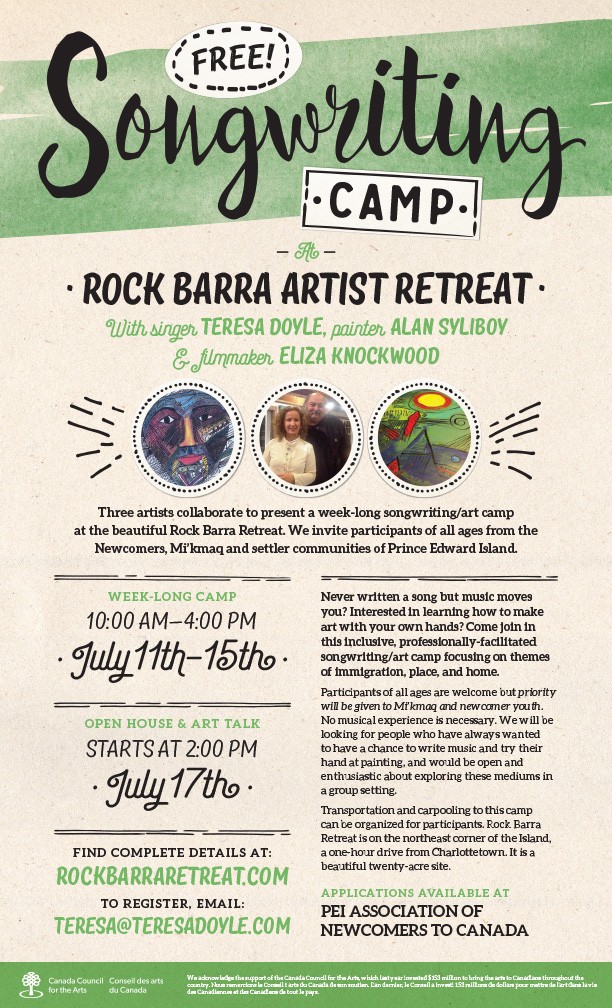 Songwriter Teresa Doyle teams up with famous Nova Scotia visual artist Alan Syliboy and filmmaker Eliza Starchild Knockwood to present a week-long songwriting camp at the beautiful Rock Barra Retreat from July 11–17, 2016 (download the application form). We will collaborate with youth from the Prince Edward Association of Newcomers to Canada, Aboriginal youth and participants from The Irish/Scottish/Acadian traditions to write songs that address the ongoing story of peoples leaving their homelands under desperate circumstances and coming to the island. Alan’s skills as a visual artist will help bridge language barriers as we “storyboard” the songs, all in a context of honouring the Mi’kmaq as the first peoples of Prince Edward Island. Be sure to visit his website at www.alansyliboy.ca.